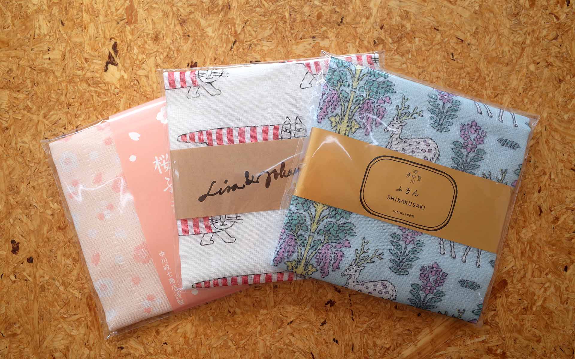 蚊帳生地のふきんはだいぶ知られるようになりましたが、奈良特産の蚊帳生地を使って作られています。目の粗い生地を数枚重ねてあり、吸水・速乾に優れ、ふきんにはもってこいの生地なのです。かつて蚊帳として活躍していた生地が用途を変え、ふきんとして現代に活かされているという、うまく変化を遂げた産業の一例です。変わらずに使われるモノも良し、変えることで生き残るのもまた良しだと思います。