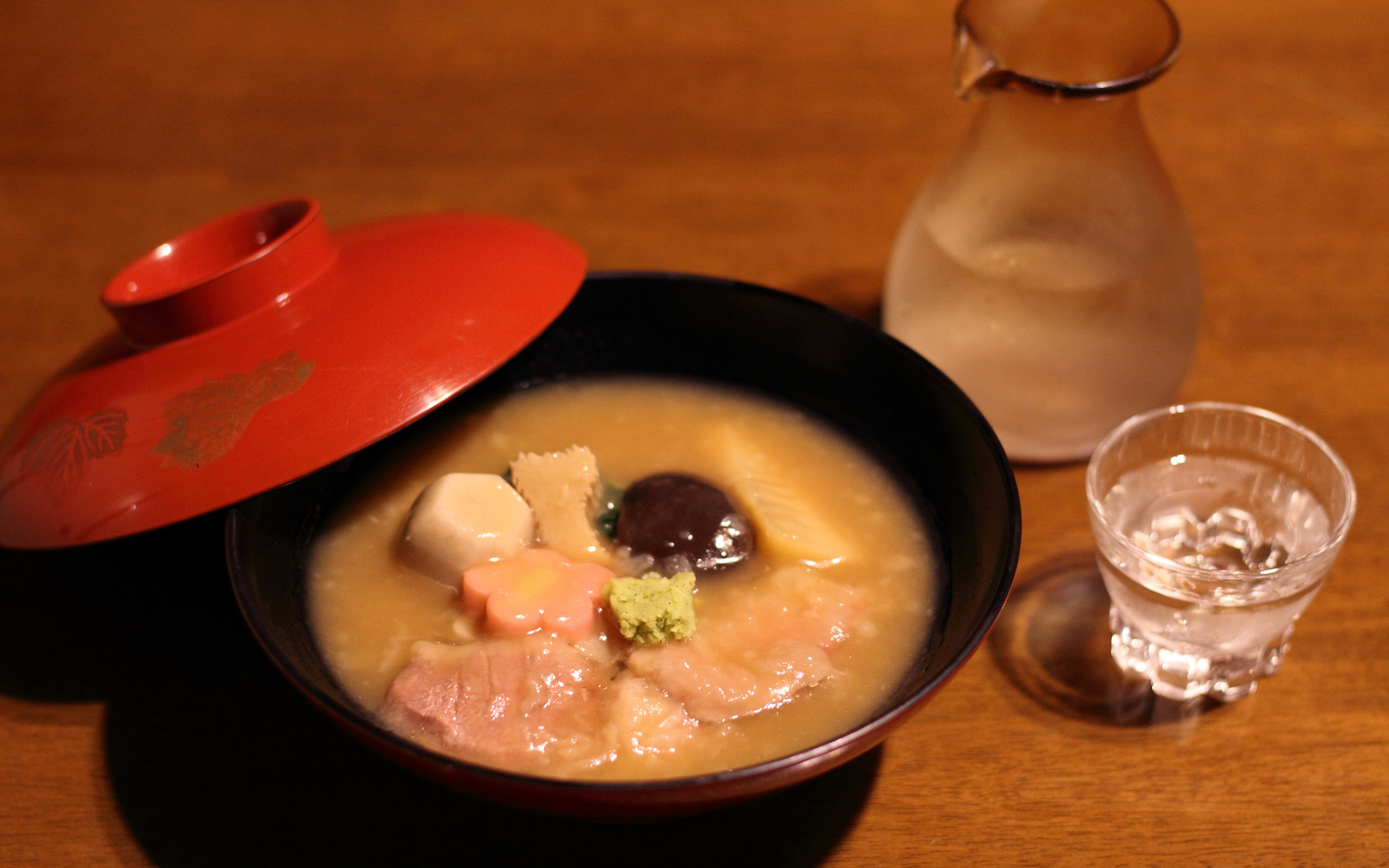 江戸時代から伝わり、加賀藩の武家料理が起源とされる料理なのだそう。輪島塗の美しいお椀の蓋を開けると、湯気と共にお醤油のいい匂いがします。さすが武家料理、贅沢に鴨肉が使われていました。加賀名物のすだれ麩、里芋、椎茸などのお野菜と一緒に煮込まれています。お砂糖のきいた甘いお醤油味の日本らしい味付け。もちろん合わせるのは日本酒です。地酒「常きげん」。しっかりとお米の香りがし、少し濃いめの治部煮にもよく合います。美しくとても美味しい加賀料理に、お酒も一合、二合、三合、、とついつい進んでしまったのは言うまでもありません。ご馳走さまでした。