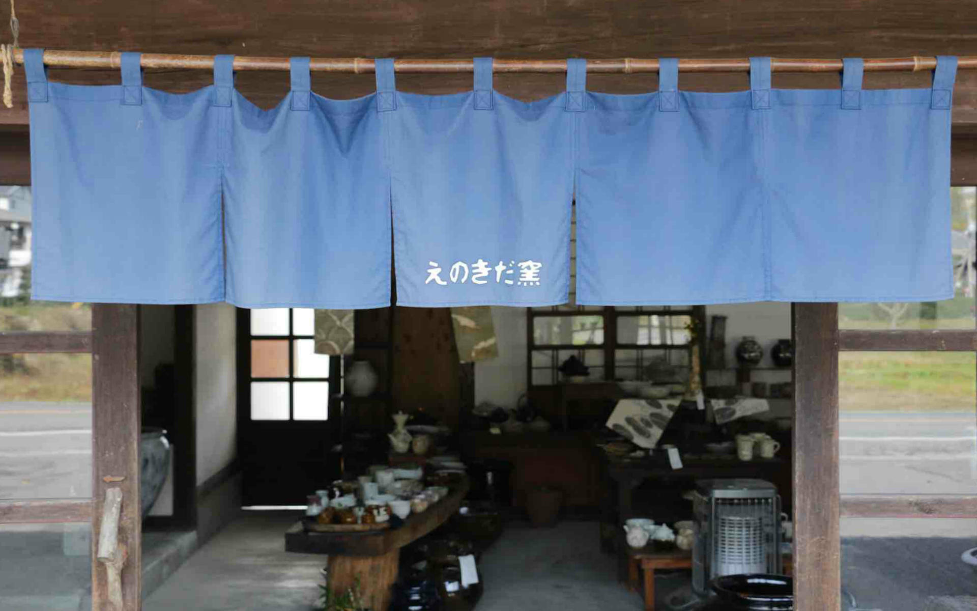 深い青色ののれんに、控えめに窯名が染め抜かれています