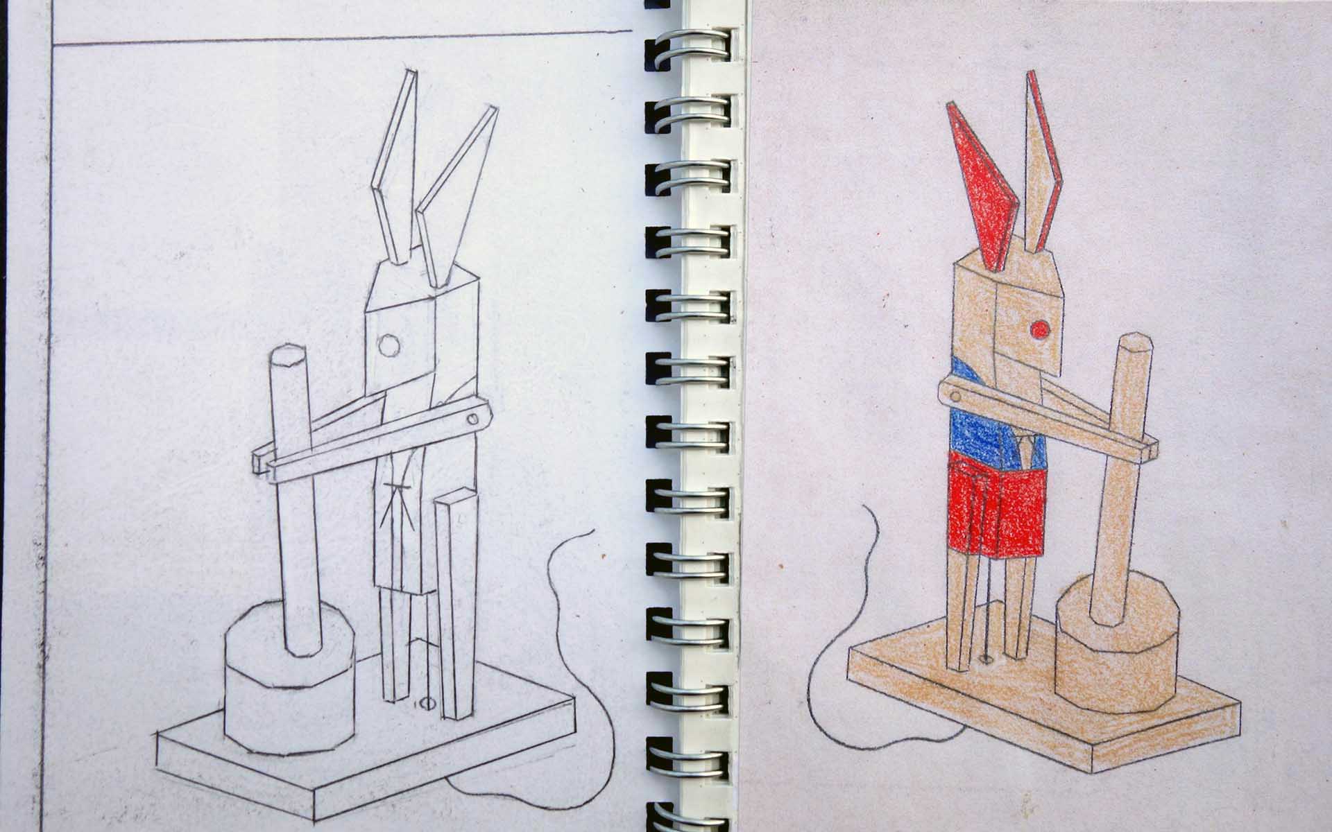 うさぎの腰巻きはカラクリを隠す機能も果たしているように思われますが、ワイズベッカーさんは「腰巻きがない方がカラクリのメカニズムが見えるし、全部木でできていることになる。より本質的になるのでは」と独自の見解をお持ちで、腰巻きのないうさぎとしばし見比べ合い。
