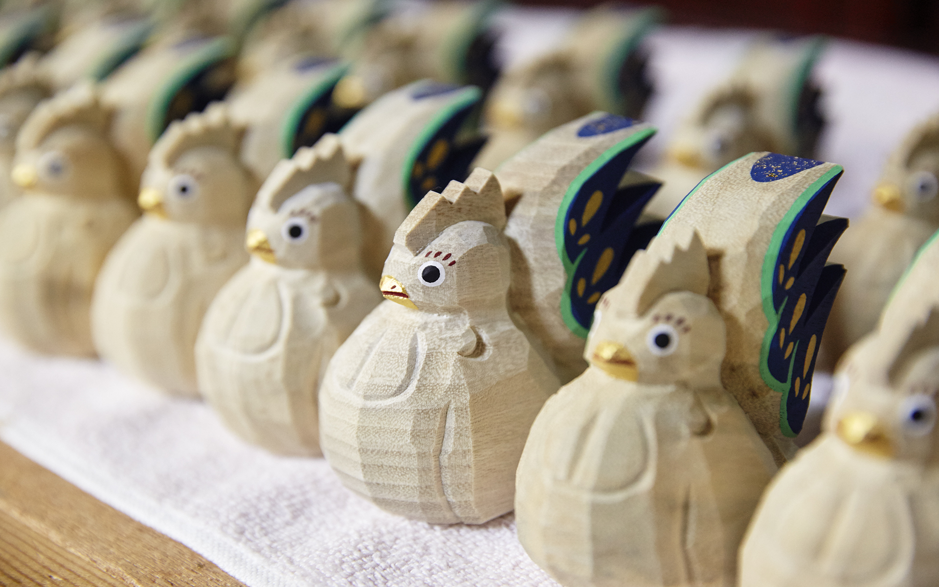 案がまとまると、いよいよ彫りです。彫りは始めに電動のこで大きく形を切り出し、その後はすべて手作業。道具を使い分けながら形を作っていきます。この日の工房にはまもなく納品という干支の酉のおき飾りが所狭しと並んでいました。