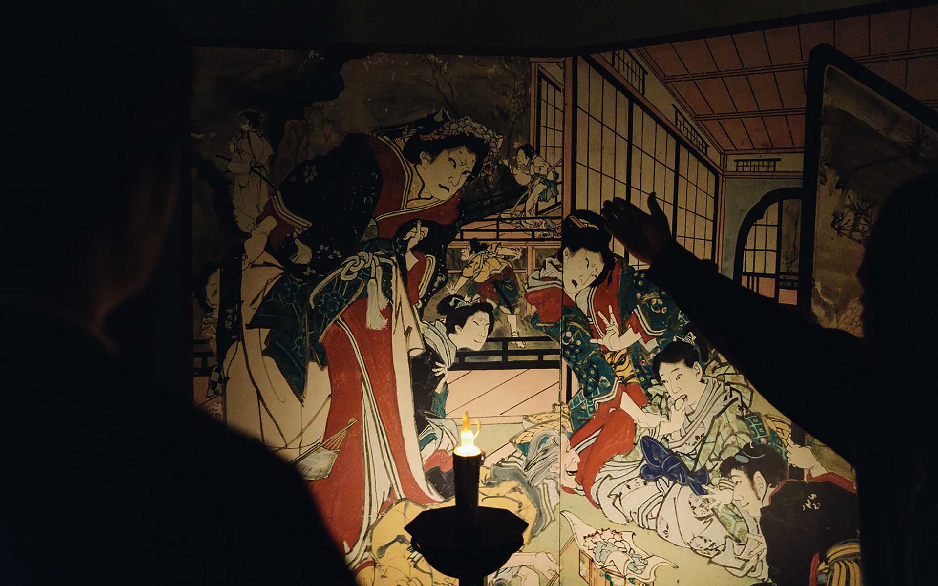 高知県香南市赤岡町にある須溜田八幡宮で毎年7月の14・15日に行われる神祭。そこでは、神社に伝わる18点の芝居絵屏風を暗闇のなかロウソクの灯りだけで鑑賞する風習が続いています。