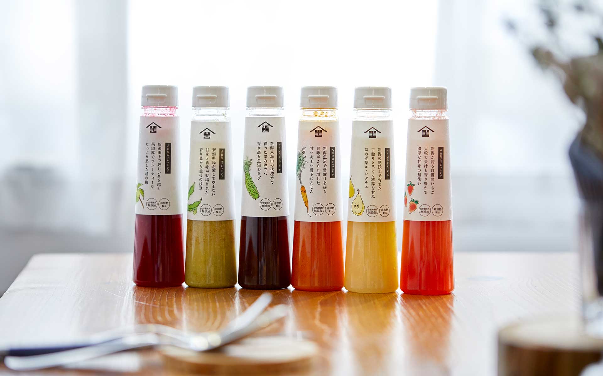 厳選した新潟県産の野菜と果物を惜しみなく使用した「八百屋のドレッシング」は、素材本来の味を保つために化学調味料、合成保存料、合成着色料無添加で、非加熱製法を採用している。