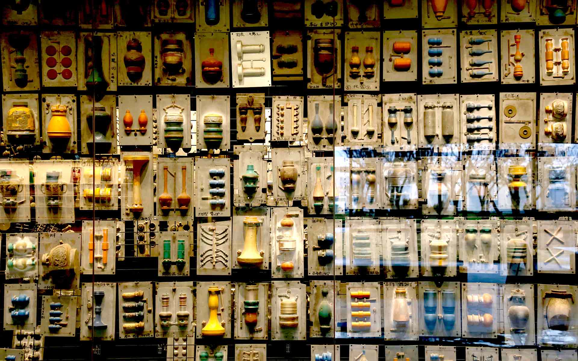 壁一面にずらりと並ぶ木型は約2500種類!カラフルなのは演出ではなく、木型のメーカーごとに色分けされているから、職人は色ですぐに必要な木型を見分けることができます。