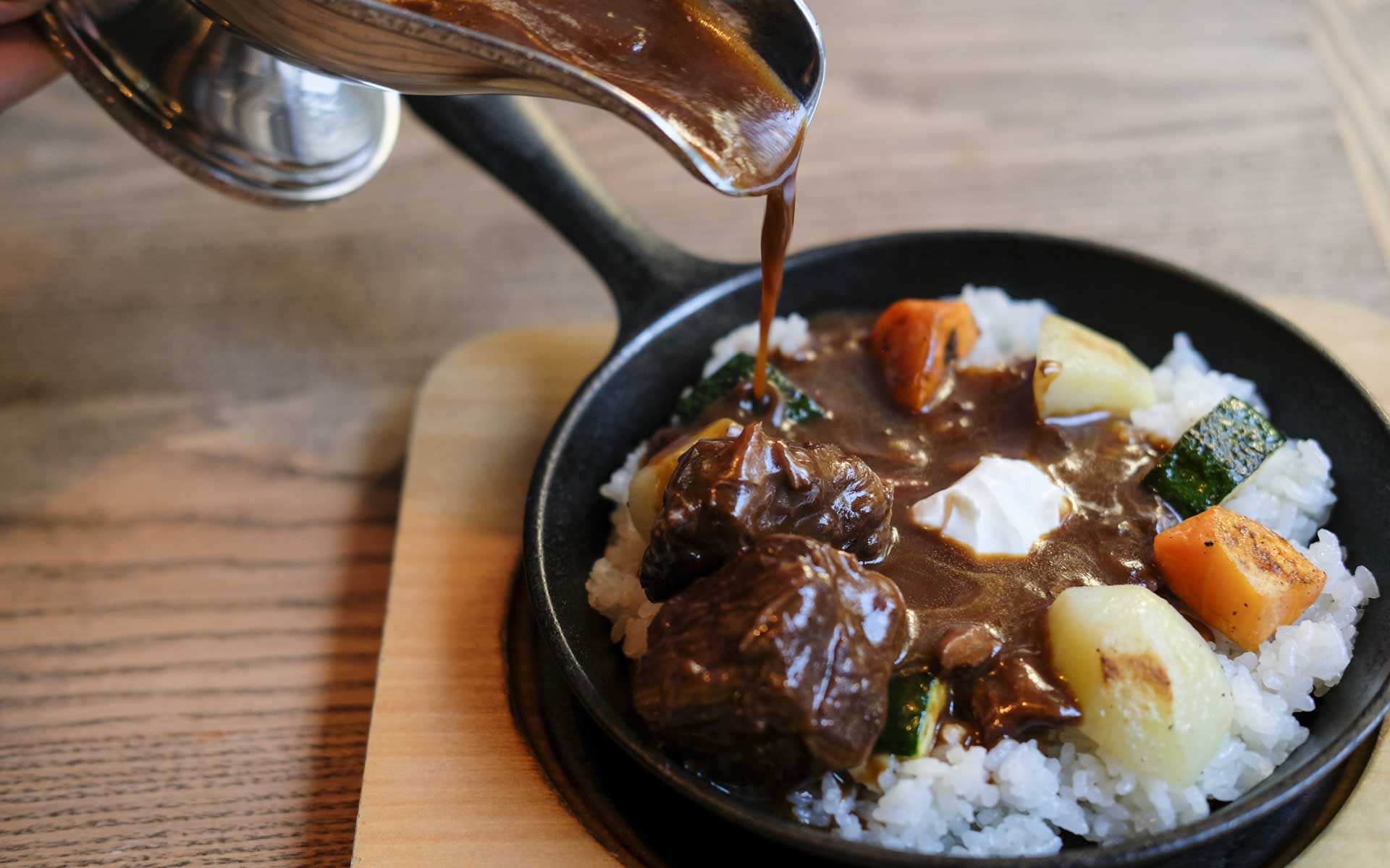 ビーフシチューライスは、バターライスに温野菜がトッピングされ、スキレットで提供されます。ポットで別添えのビーフシチューはA5ランクの和牛がゴロッと入り、赤ワインがきいた味。香味野菜やトマト、タマネギなどをじっくり煮込み、濃厚なコクがあります。