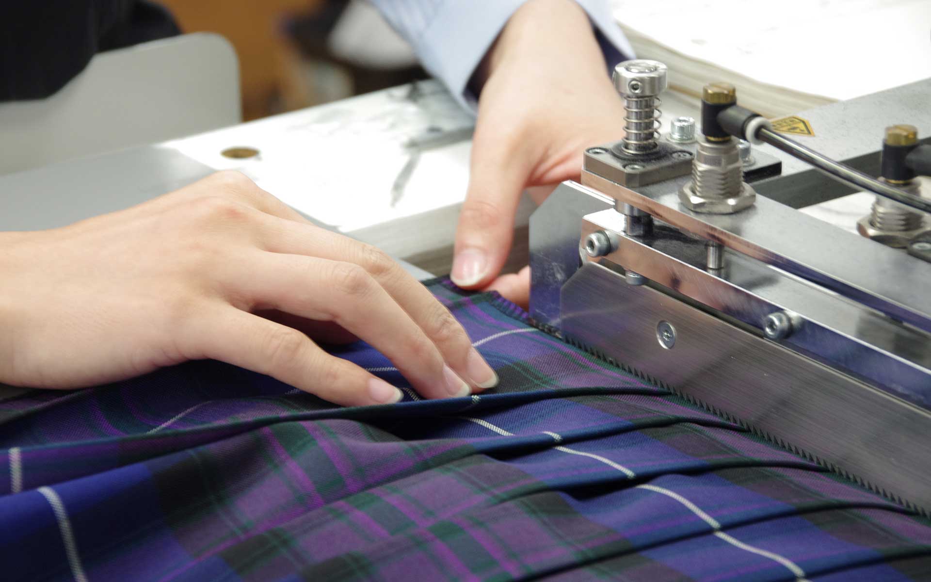 プリーツスカートの折り目にチェック柄がずれないように正確に合わせていき、ウエストの寸法出しをする工程。同じ生地で、サイズが違っても同じように柄を再現していく