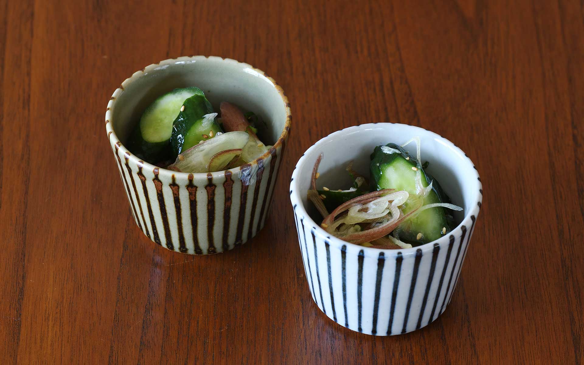 こんな季節になってくると、酢の物や浅漬けを食べたい日が多く、そんな時は決まってそばちょこに盛り付ける。