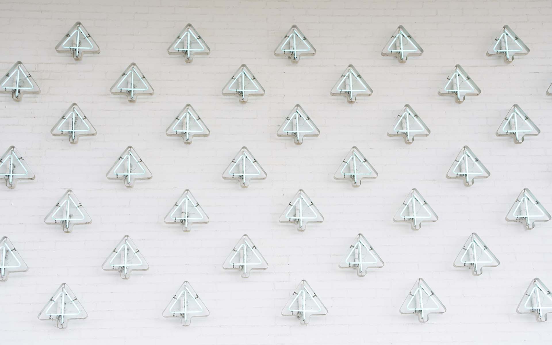 白い建物の入口には、何やら木のような形の青いネオン管が壁面に‥‥。